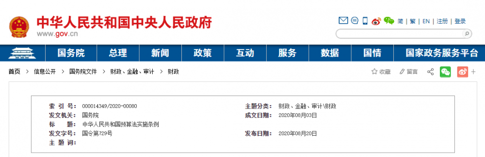 现公布修订后的《中华人民共和国预算法实施条例》,自2020年10月1日起施行。