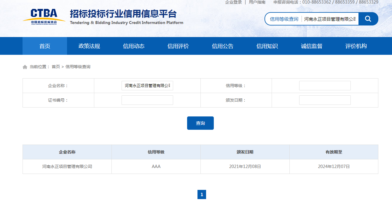 荣誉丨河南永正项目公司再获中国招标投标协会招标代理机构信用评价AAA单位