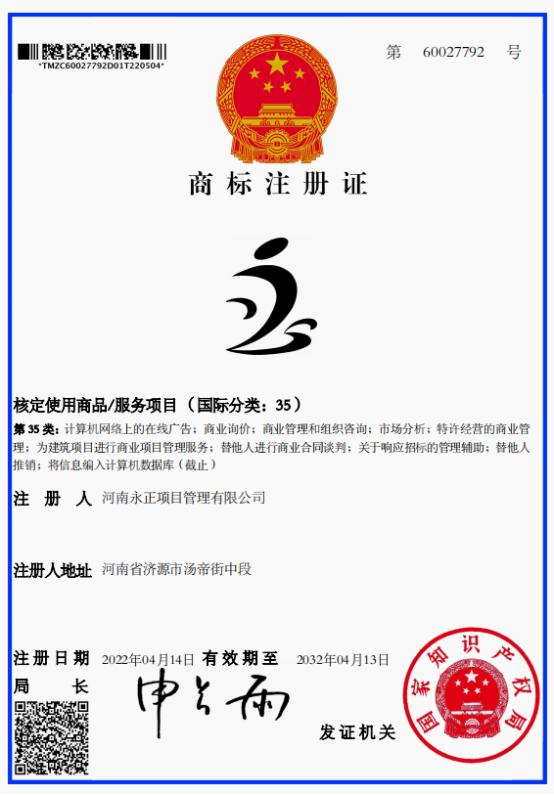 雷火官网地址创立于2011年6月,公司成立至今,始终围绕服务与发展两大主题,致力于打造“力创咨询精英,争创百年永正”。为保证提供商品和服务质量,维护公司信誉,保护各方利益,公司决定注册自己的商标。2022年4月经国家知识产权局批准,公司分别取得了第60009101号和60027792号商标注册证,注册商标核定使用商品/服务项目为第42类(国际分类:42)和第35类(国际分类:35)。公司取得商标注册证后,将会以更加严格的标准按照法律法规等规定,规范各项业务操作,保障国家与公共利益,维护公平竞争的良好秩序以及各方的合法权益,接受行政机关的监管和行业自律组织业务指导,以精湛的专业技能和良好的职业操守,竭诚为客户提供优质、一流、满意的服务。