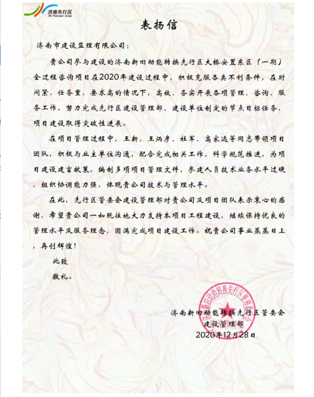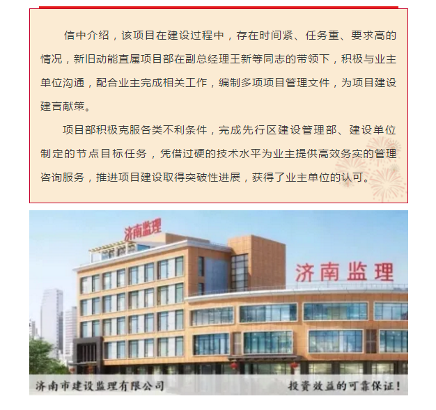 新旧动能直属项目部收到业主来信表扬