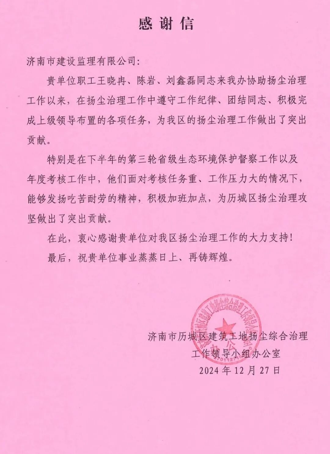近日,我公司历城区住建局第三方巡检项目收到了来自历城区建筑工地扬尘综合治理工作领导小组办公室表扬信,信中对我公司项目工作人员的业务水平、责任心、组织协调能力给予充分肯定。