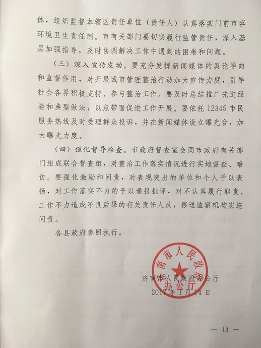 关于转发《济南市人民政府办公厅关于开展城市管理整治行动》的通知